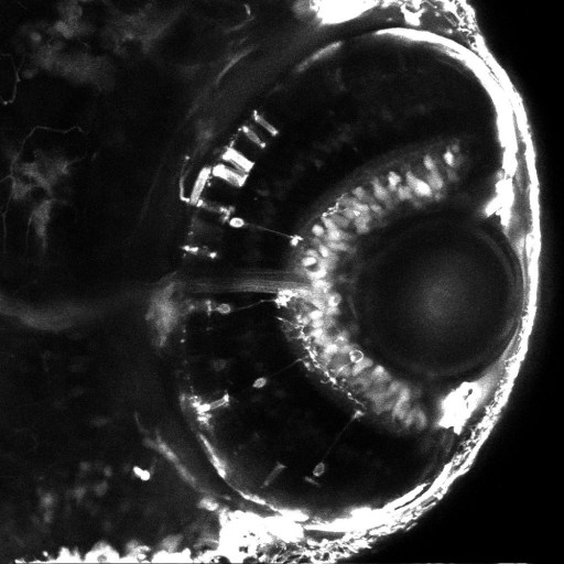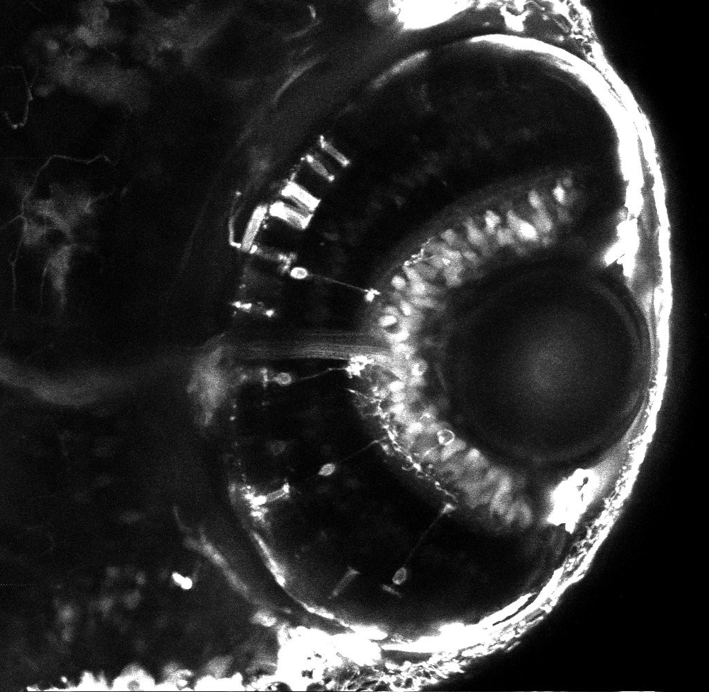 Mosaic fluorescent labelling of excitatory cell types (Photoreceptors, Bipolar Cells and Ganglion Cells) within a 4 dpf old zebrafish retina under 2 photon excitation